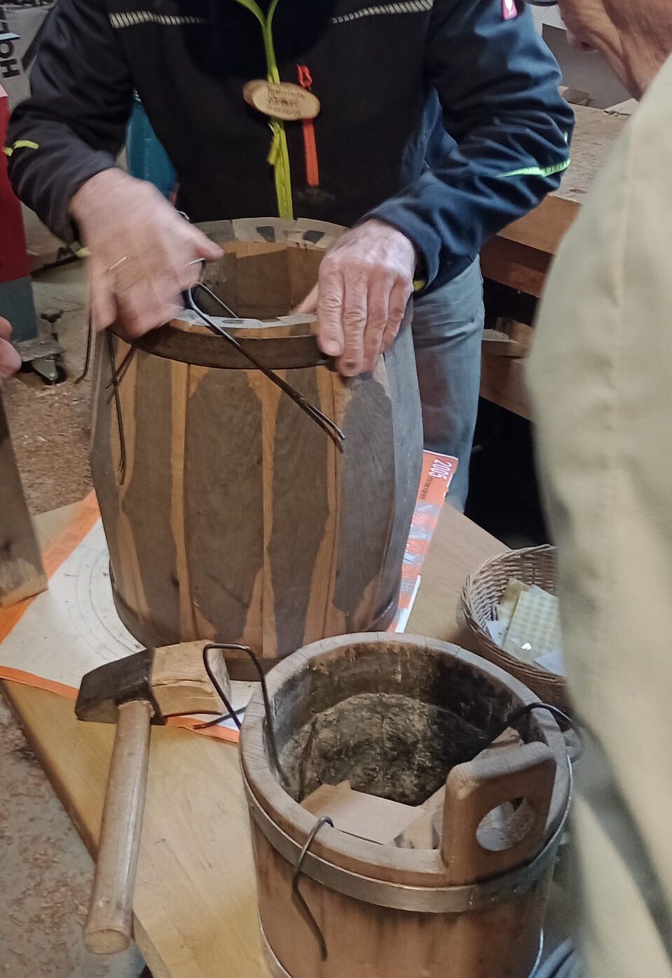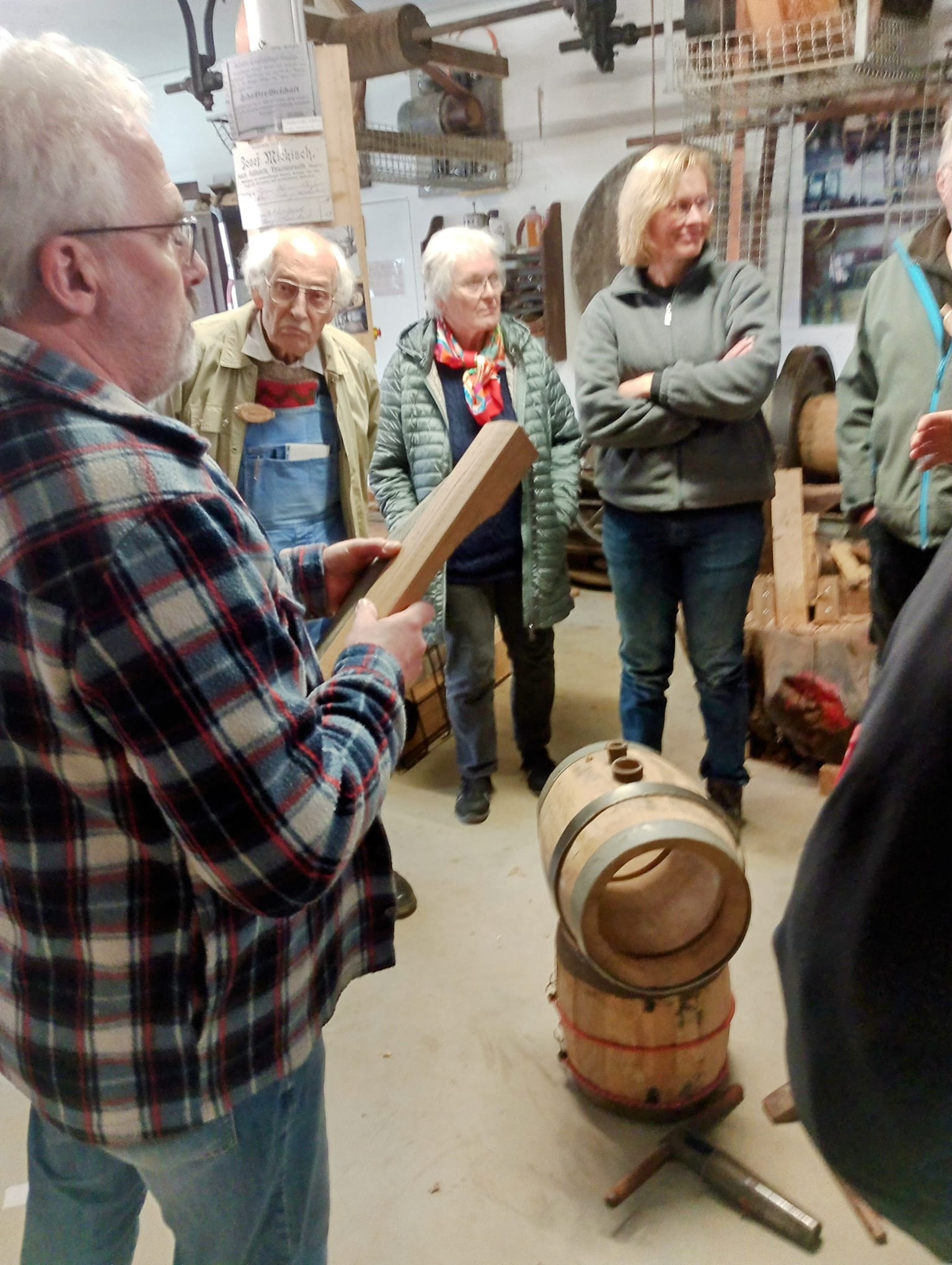 Am Freitag und Samstag (19. u. 20. April 2024) wurde in der Tirschenreuther Handwerkerscheune eifrig gewerkelt. Acht Teilnehmer , ein älterer Herr aus Straubing, ein 32-Jähriger aus Thüringen und sechs Oberpfälzer, darunter zwei Frauen, wollten unter Anleitung eines gelernten Fassbinders am Fassherstellen teilhaben. Peter Grassy war zum zweiten Male gekommen, um das Fachwissen nach 40 Jahren Berufserfahrung weiter zu geben. Die Interessenten stellten sich vor als Maschinenbauingenieur, über Metallbaumeister, ehem. Bierbrauer, Fachlehrer usw. Alle waren gekommen, um die Herstellung eines Bierfasses zu erlernen. Einige in der Absicht, ein fertiges Fass mit nach Hause zu nehmen. Dieser besonderen Herausforderung stellte sich der Arbeitskreis unter der Organisation von Herbert Konrad mit seinen Mitstreitern vom AK und bereiteten entsprechend vor. Bürgermeister Franz Stahl begrüßte am Freitag die Teilnehmer in der Tirschenreuther Handwerkerscheune, der Ausstelle des Museumsquartiers (MQ) und wünschte einen unfallfreien Verlauf. Fachmann Grassy erklärte die Besonderheit vom Fassholz, die einzelnen Arbeitsvorgänge, die besonderen Werkzeuge und Fachausdrücke, wie Fassdaube, Spundlochbohrer, Brunst- und Bauchreifen usw.