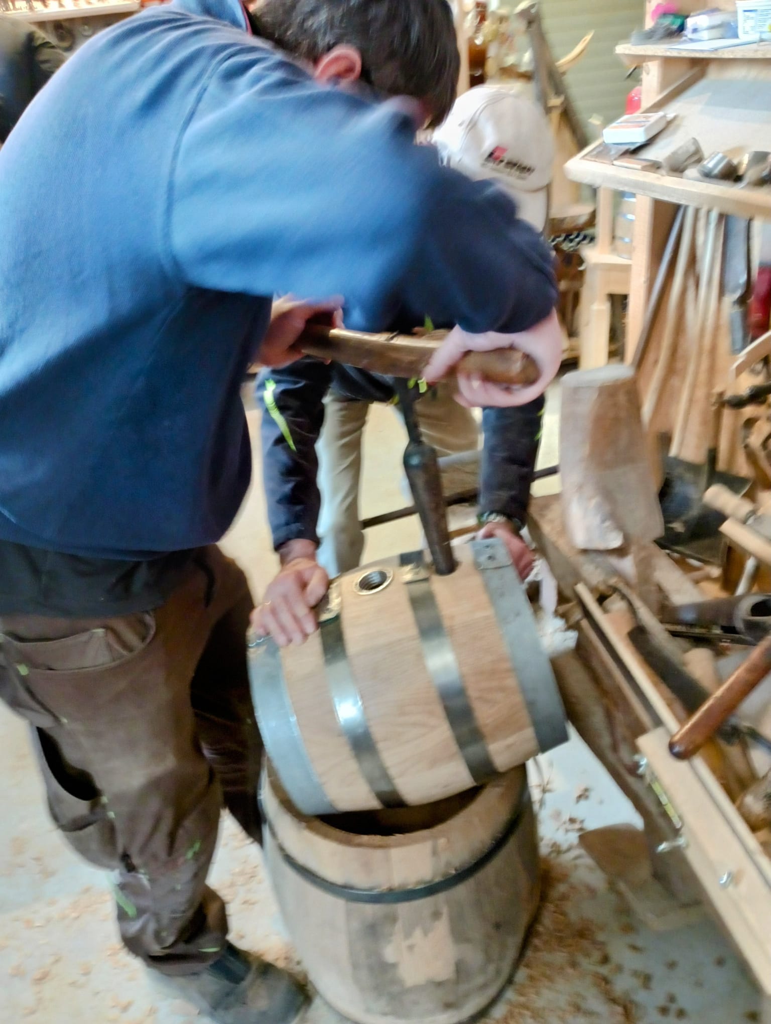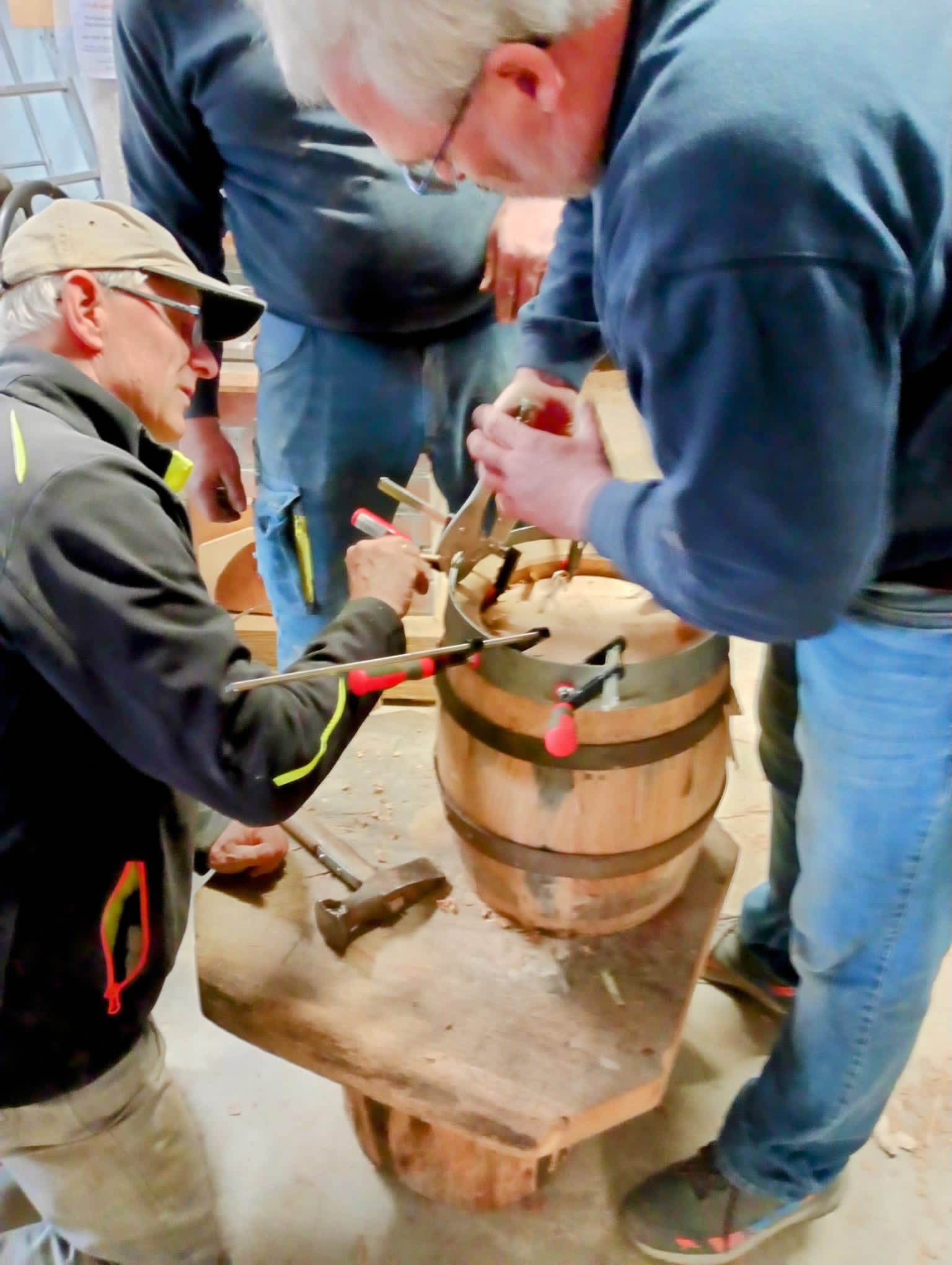 Sodann ging es an die Arbeit, Fassdauben ablängen, ausbauen, biegen, streifen und zusammenfügen, bis die einzelnen Fassdauben im Setzreifen ein Fassrund -ohne Spalten- ergaben. Eingepasst in die über 100 Jahre alte Stemmmaschine wurde dem Fass an Kopf- und Fußseite die Rundung samt Kimme eingefräst. Ausmessen und Aussägen von Boden und Deckel und Einpassen, Fassreifen herstellen und auftreiben auf das abgehobelte Fass. Das Fass nahm Form an und benötigte noch Spund-, Zapf- und Pfeifenloch. So wurden in den beiden Tagen zwei Fässer nahezu vollständig fertig gestellt und weitere zwei vorbereitet.