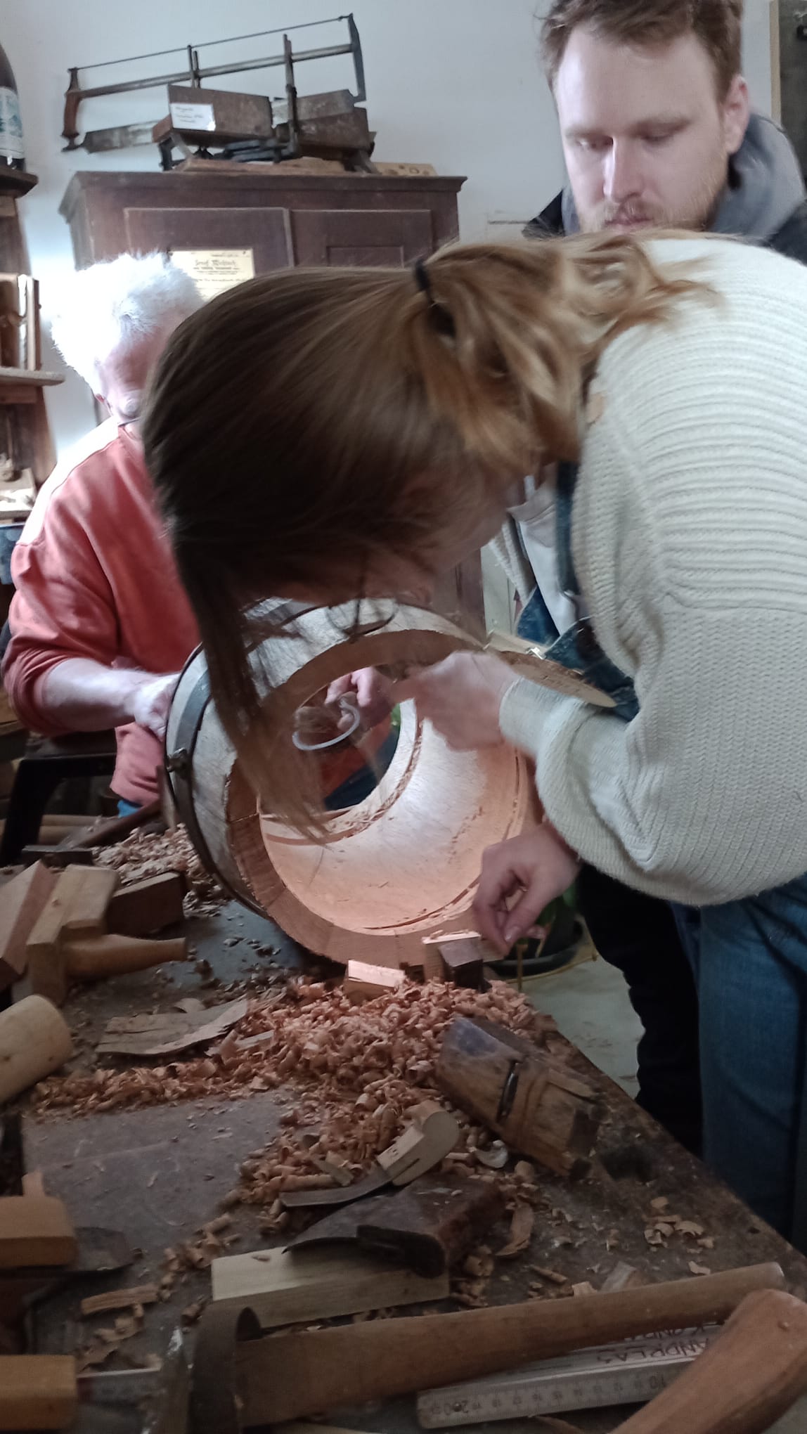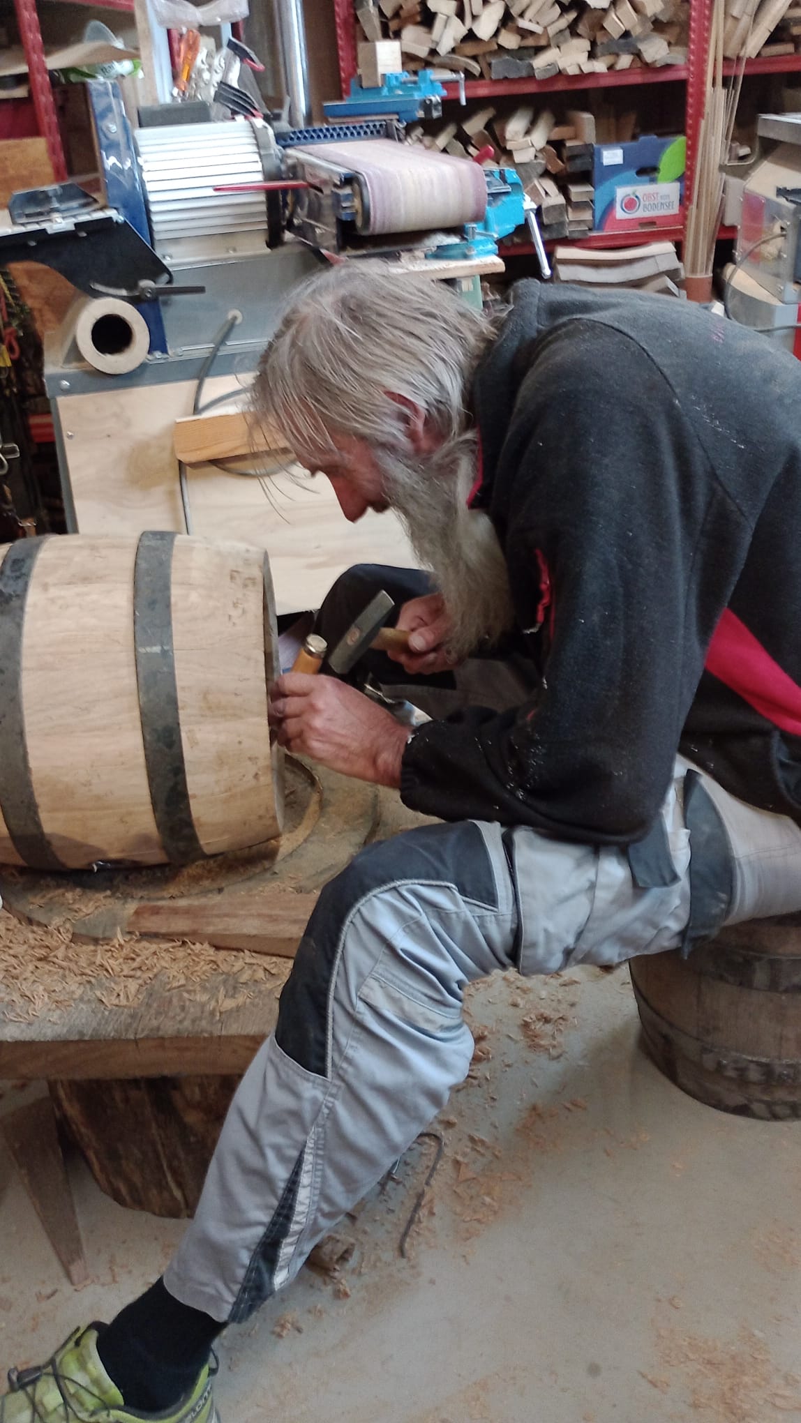 Zum Fassbinderkurs kamen eine Frau und vier Männer von weither angereist. Den weitesten Weg nahm der Hirte aus dem Kleinwalsertal auf sich, andere wohnen im Allgäu, in Dillingen und einer im Stiftland. Alle wollten unter Anleitung eines gelernten Fassmachers mit eigenen Händen ein Bier- oder Whisky-Fass anfertigen. Dabei hatte der Münchner einige theoretische Hinweise parat und seine praktischen Erfahrungen aus 40 Berufsjahren waren gefragt. Rasch erkannten die Teilnehmer, dass vielfache Arbeitsschritte erforderlich sind. Noch einfach gestaltet sich das Ablängen und Abrunden der Holzteile, ebenso das Weichmachen im Siedebottich und zum Biegen kam dann die schwere Biegemaschine zum Einsatz. Schwieriger gestaltete sich das Zusammenstellen zum Fassrund im Setzreifen. Hier war ein genaues Zusammenfügen wichtig. Das Ausfräsen geschah dann mit der 100 Jahre alten Stemmmaschine.